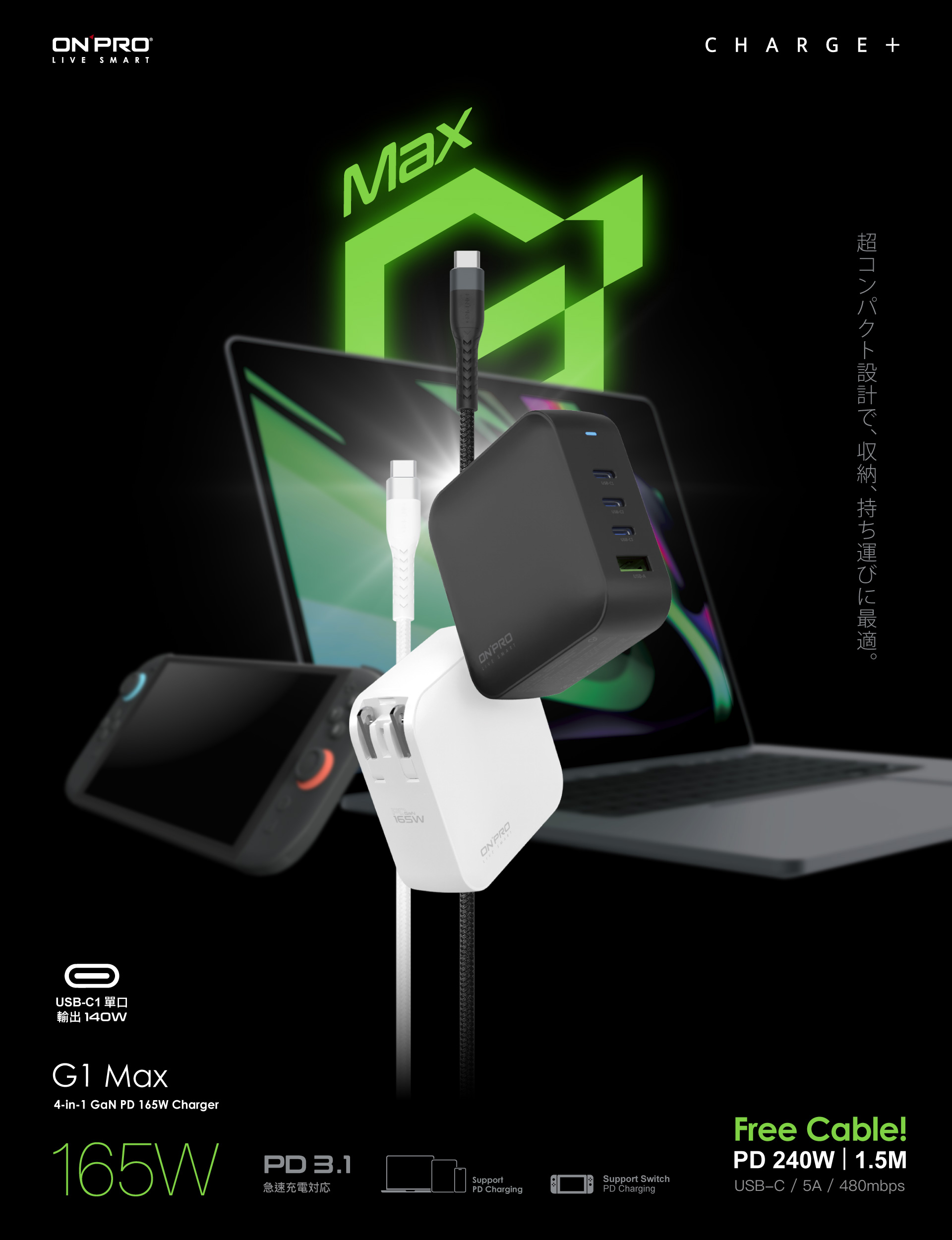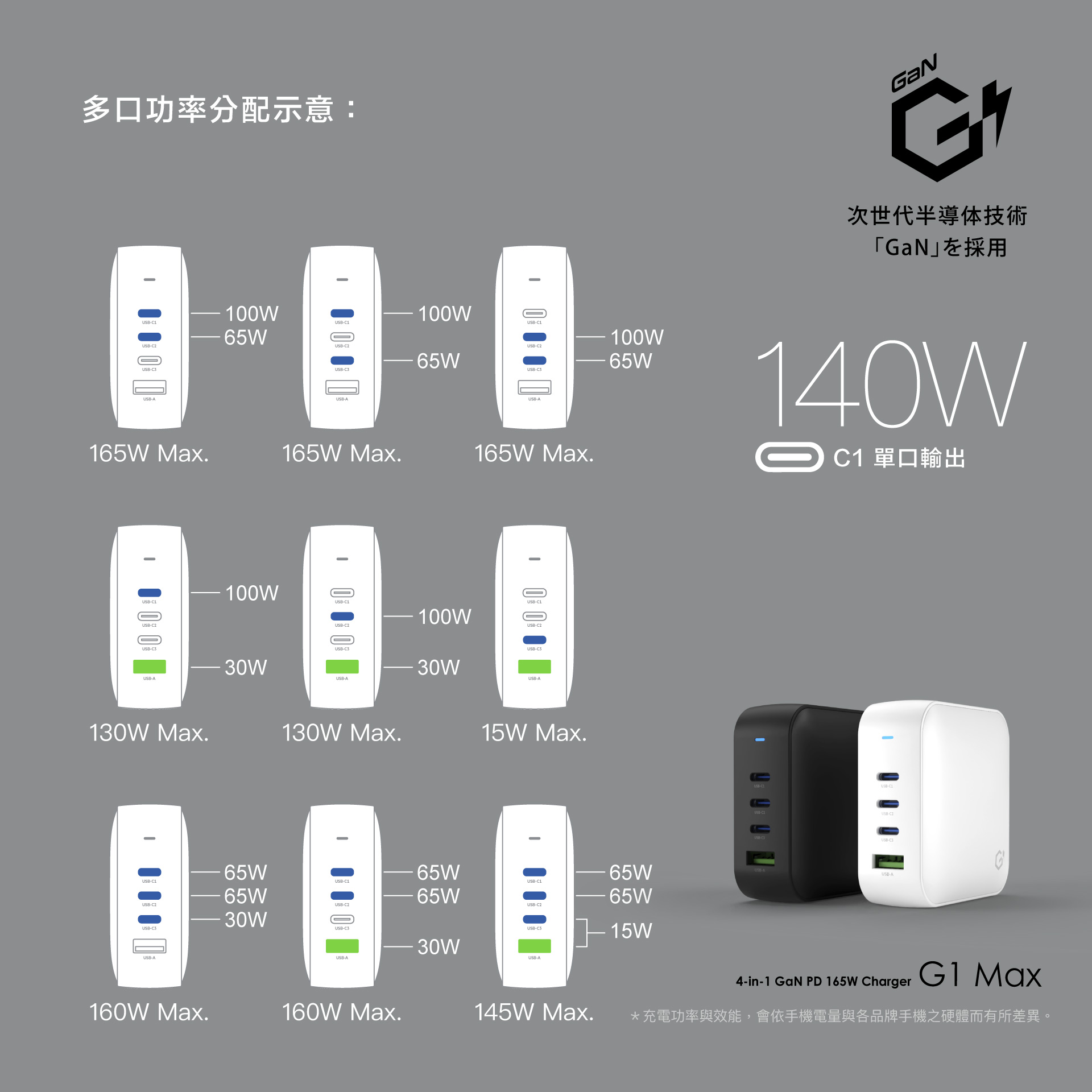 氮化鎵GaN PD165W 4孔快充 超急速充電器 – 冰雪白 / 石墨黑